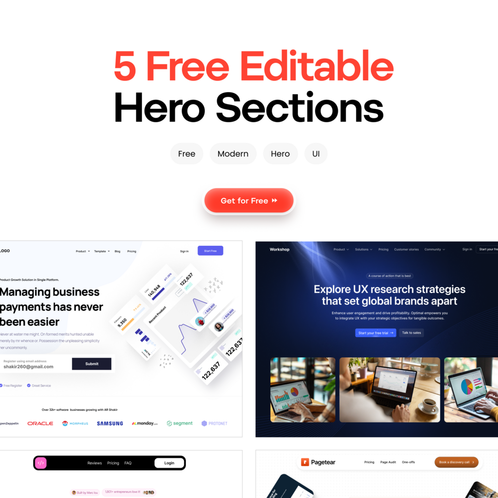 These hero sections are fully editable in Figma, making it effortless to customize text, buttons, colors, or layout to fit any brand or project. Or simply plug-and-play — the designs are so well-made that you can just replace the name and CTA and you're good to go!